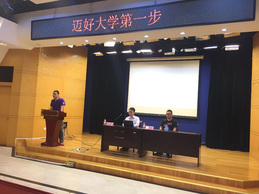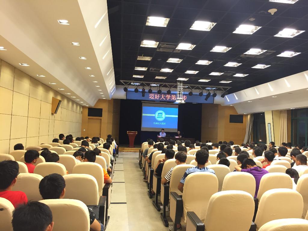 2016年9月28日,金沙总站6165地址09级毕业生机器达人创始人李睿深学长、机器达人运营主管王鹏飞学长为2016级大一新生开展了主题为“迈好大学第一步”的专题讲座。讲座在基础学院多功能报告厅举行,会议由金沙总站6165地址辅导员石占魁老师主持,全体大一学生参加了本次讲座。
