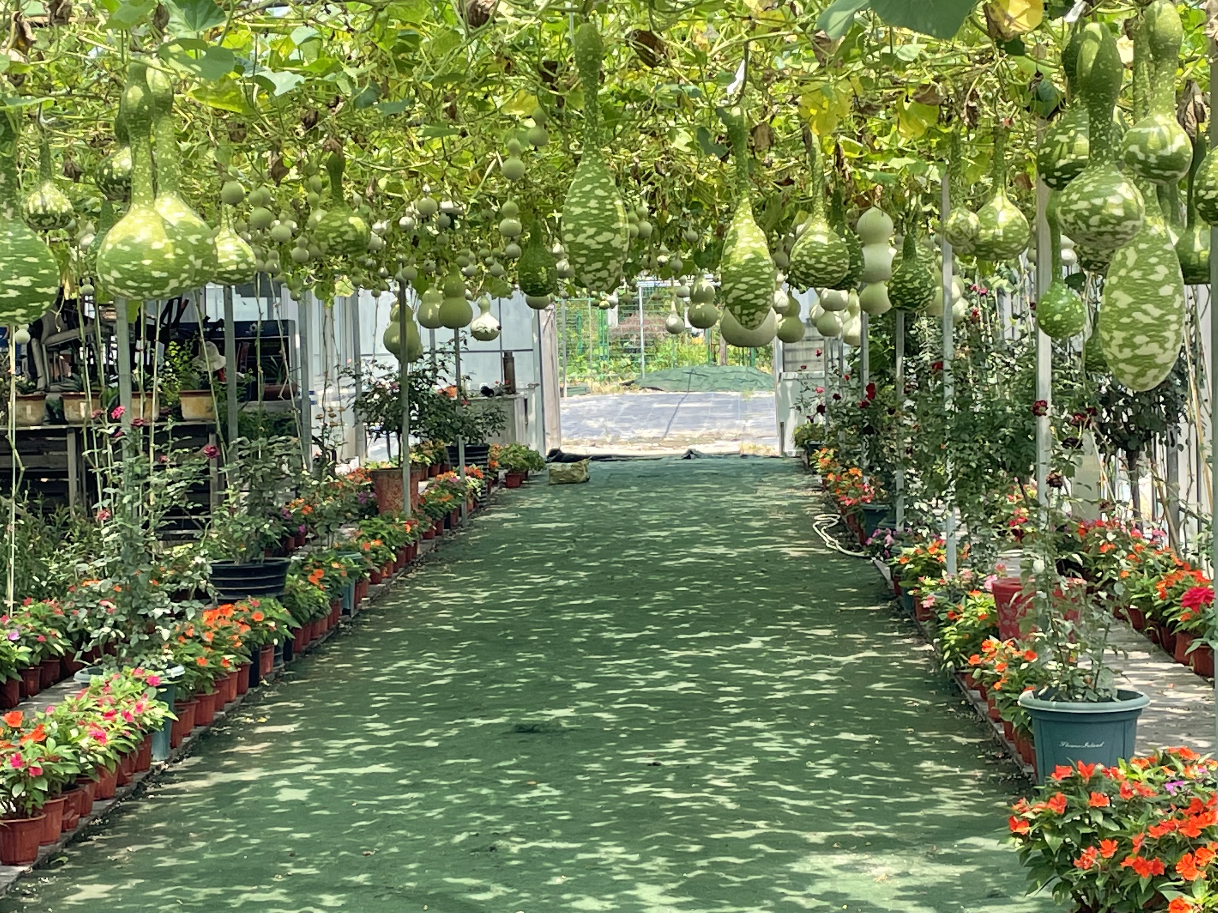 月狮村给人最直观的感受就是景色宜人,文化韵味浓厚。“推窗见绿,移步换景”是月狮村的一大特色。鲍老师介绍说,月狮村曾多次举办花展,已经打出了响亮的招牌,这里的村民围绕“花产业”做文章,利用地理优势,将花变成近郊旅游资源,打开了花文化的窗口。此时正值葫芦成熟之际,在月狮村的葫芦种植园中,或大或小、或圆或长的葫芦千姿百态地悬挂在棚架上,展示着月狮村的美丽风情。