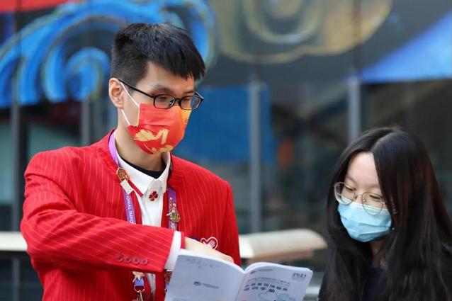 2021年黎卓羿同学再次站在了站在进博会的志愿者岗位上,作为人文交流平台展出事务组的组长,负责中央广场和8米层的人文展台,在岗位上协助人文展台维持秩序。今年新冠疫情反复,在如此特殊的时间,越是困难,留下的记忆越是珍贵。面对疫情期间的志愿黎卓羿说:“口罩遮住了我们脸庞,挡不住的是我们热情微笑的眼睛,进博会期间实实在在的服务帮助了他人,让我感到非常快乐和充实。”