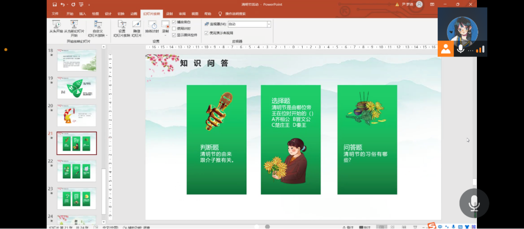 3、 介绍清明节与革命烈士相关的小知识,通过知识问答形式来使大家参与其中。通过本次活动学生对清明有了更多的认识,对革命烈士也有了更深的了解,同时还深深地体会到幸福生活来之不易,更懂得珍惜幸福生活。