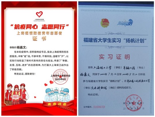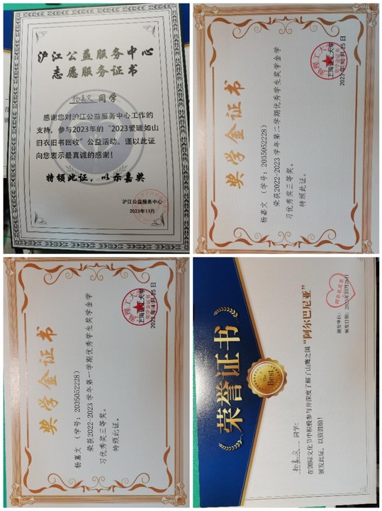 此外,他还积极投身社会公益,成为了上海理工大学志愿者的一员,积极参与校内各项活动的志愿者。同时,他还主动担任上海市机械创新大赛的志愿者,负责对接参赛选手、发布通知,并在比赛中为选手们解决各类问题,展现了出色的组织协调能力和应变能力。