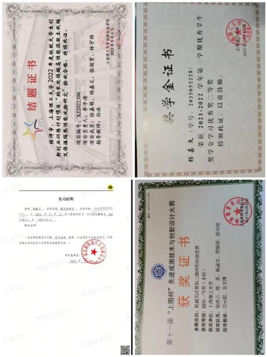 在大学四年的黄金时光里,杨嘉文始终保持着高度的热情和积极的态度,为自己的大学生活谱写了丰富多彩的篇章。在大一那年,他勇敢地踏入了第十一届“上图杯”先进成图技术与创新设计大赛的赛场。经过学校三轮严格的筛选,凭借出色的实力和毅力,成功跻身正式参赛名单。在团队中,他发挥出色的团队合作精神,与队友们默契配合,最终斩获了上海市团体一等奖的殊荣,为自己的大学生活增添了浓墨重彩的一笔。