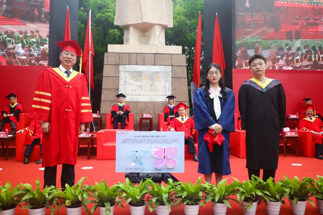 在毕业典礼上,吴冠睿作为毕业生代表,向母校赠送了一份特殊的毕业礼物——飞翼智蝶,这是对四年大学生活最深情的告别。这份礼物不仅承载着他对学校培养的感激之情,更象征着毕业生们破茧成蝶,展翅高飞。这一刻,不仅是对过往岁月的缅怀,也是对未来旅程的憧憬。