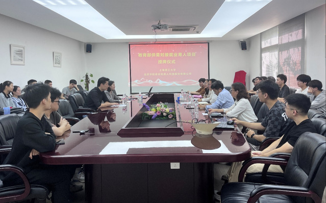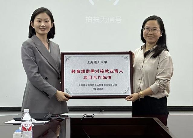 在热烈的掌声中,北京华航唯实机器人科技股份有限公司向上海理工大学授予了“教育部供需对接就业育人项目合作院校”的牌匾。随着项目挂牌的正式落地,实践基地项目的第一场活动《产教融合谋新篇知行合一育匠人》就业育人讲座随即展开。