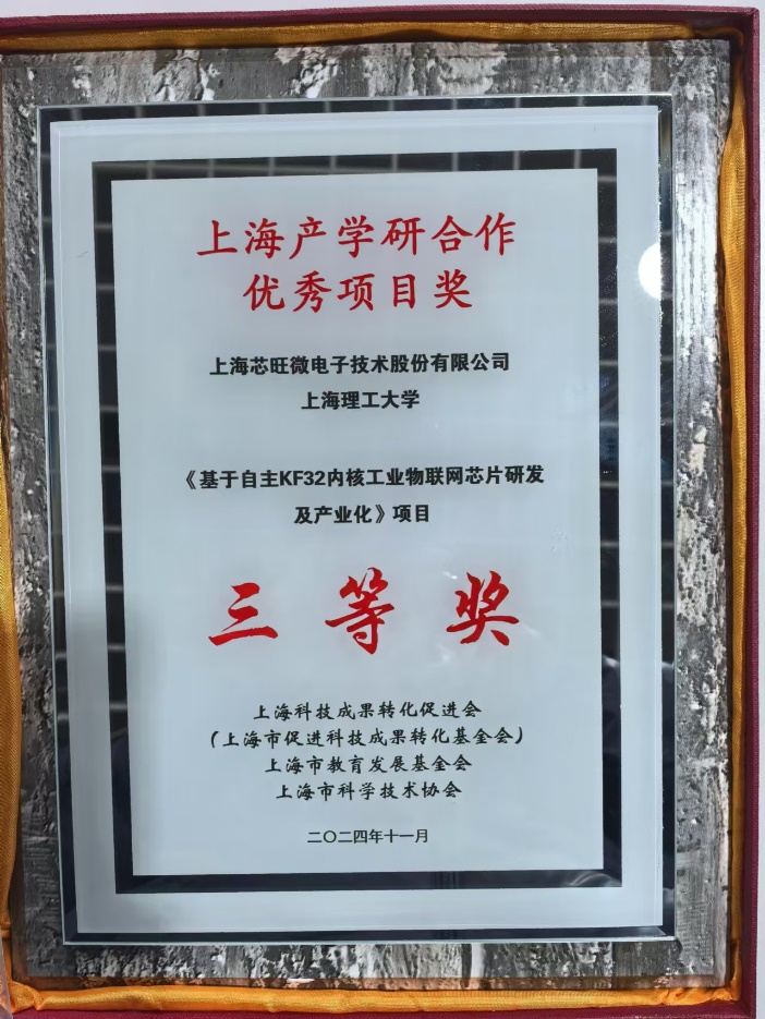 12月11日上午,2024年度“上海产学研合作优秀项目奖”(简称“上海产学研奖”)表彰大会在上海市政协举行。上海市政协主席胡文容出席,并为获奖项目颁奖。我校夏鲲教授团队与上海芯旺微电子技术股份有限公司合作的项目《基于自主KF32内核工业物联网芯片研发及产业化》获“上海产学研合作优秀项目奖”三等奖。