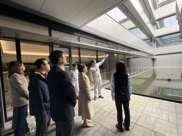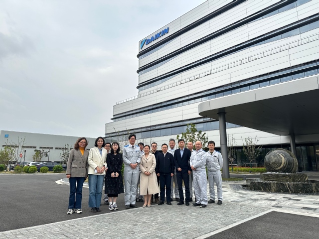 调研伊始,西河尚志总经理带领校方团队参观大金苏州研发中心,重点展示全球领先的零能耗大楼技术应用。该建筑通过可再生能源利用、高效热泵系统及智能化能源管理,实现全年净能耗趋近于零,彰显企业绿色智造理念与技术实力。校方代表对大楼的节能设计、制冷压缩机创新应用等表示高度关注,认为其技术路径为高校科研与工程实践结合提供了重要参考。