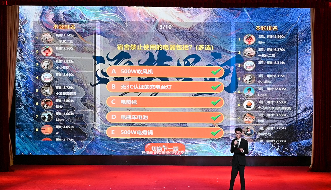 宿舍里可以使用500W吹风机和无3C认证的充电台灯等电器吗?校长奖学金你了解了吗?保卫处的电话是哪两个?迟到多久不能进考场呢?在报告会的互动环节中引起了同学们的积极思考,大家纷纷踊跃参与。此次互动通过选取同学们身边核心、疑难、常见问题,同学们更加深入地了解了创新创业大作业学分的评定标准、宿舍电器管理规定、作弊行为的处分条例、医保报销规则等关键制度,激发了同学们的积极性,宣传效果优异。